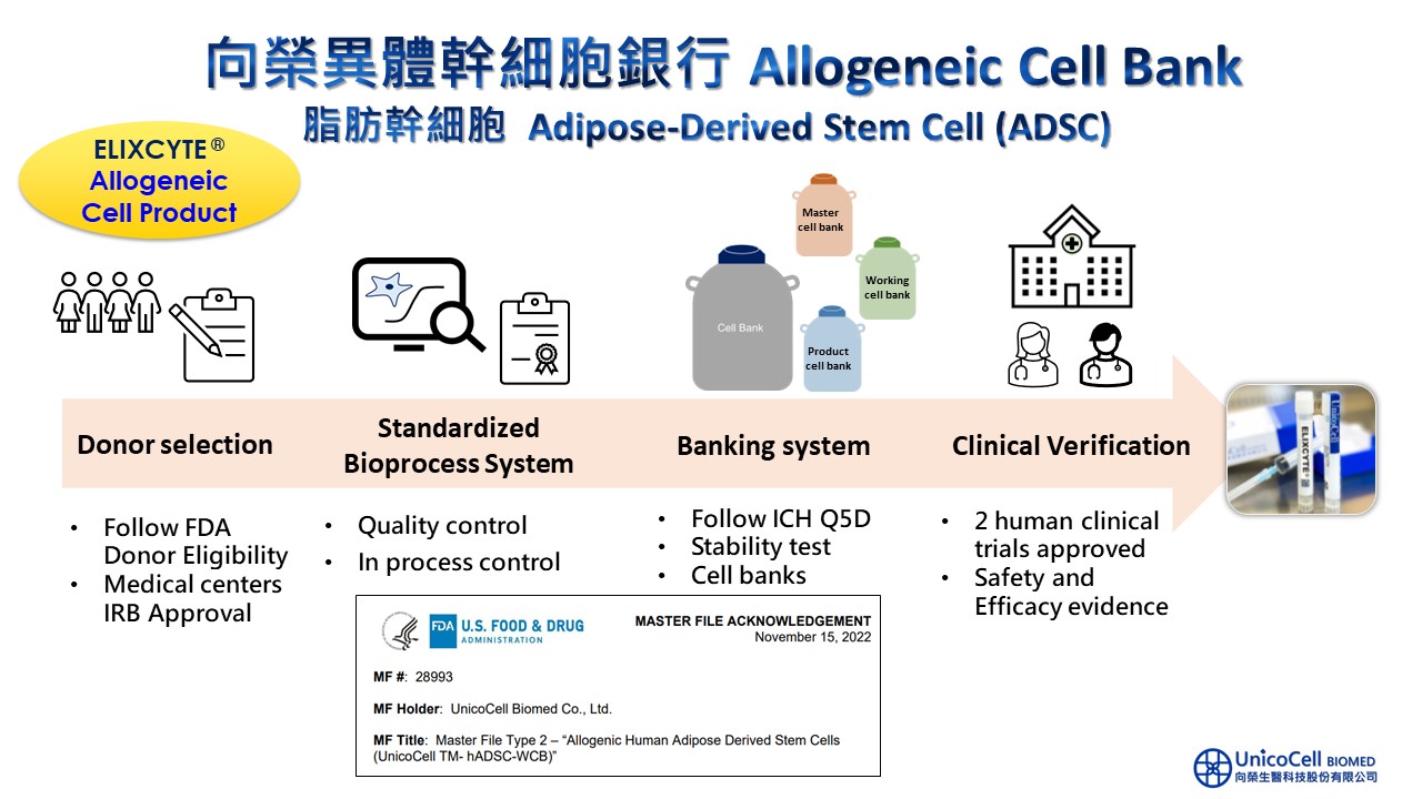 向榮生技擁有台灣唯一獲得美國FDA認可異體幹細胞庫,符合國際法規要求,可應用於多元再生醫學領域開發。標準化剛性製程結合細胞製劑量產技術與長期安定性驗證,可確保細胞產品批次穩定性,有利國人之再生醫療需求與疾病治療,為臨床試驗、商業生產或CDMO建立重要基礎。