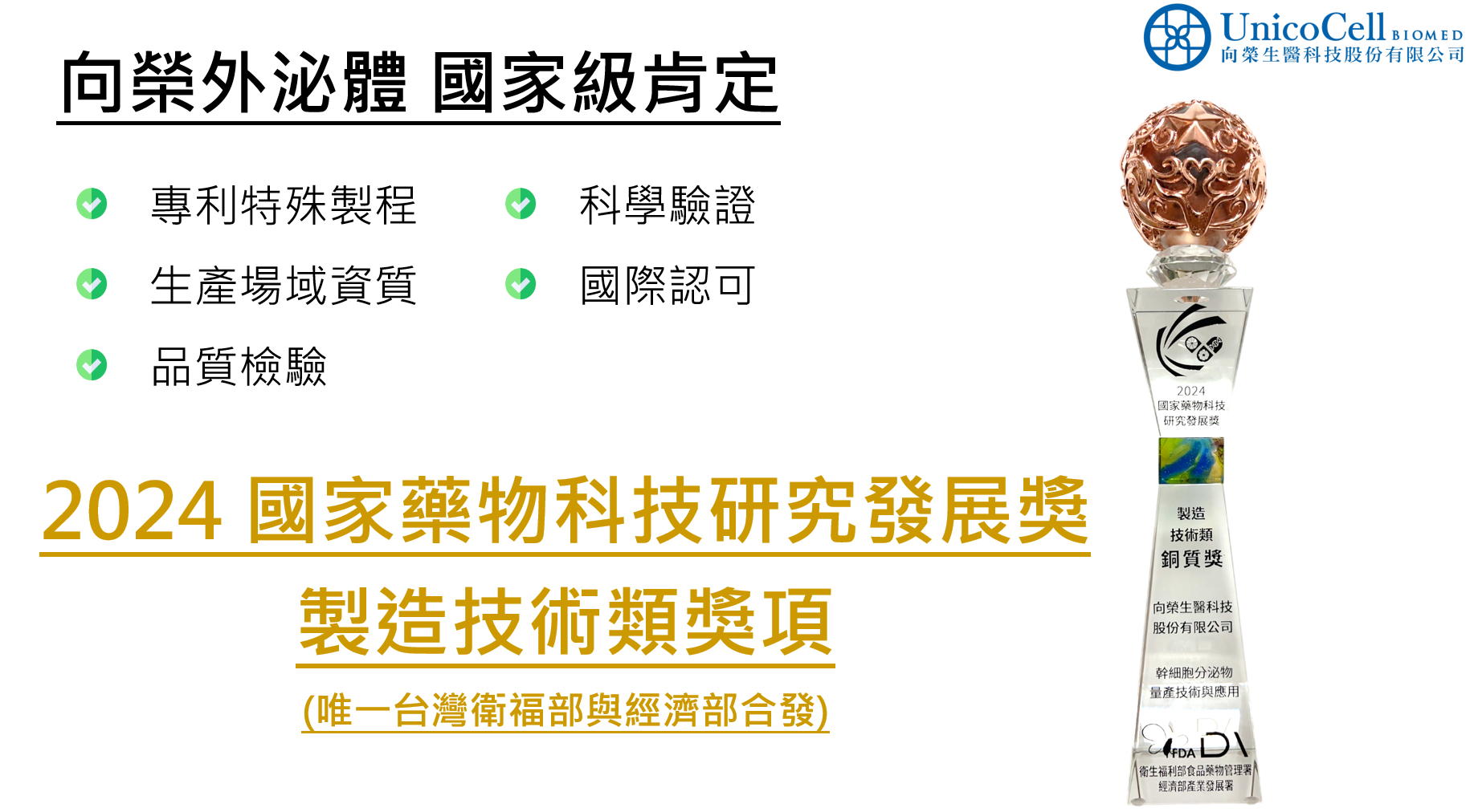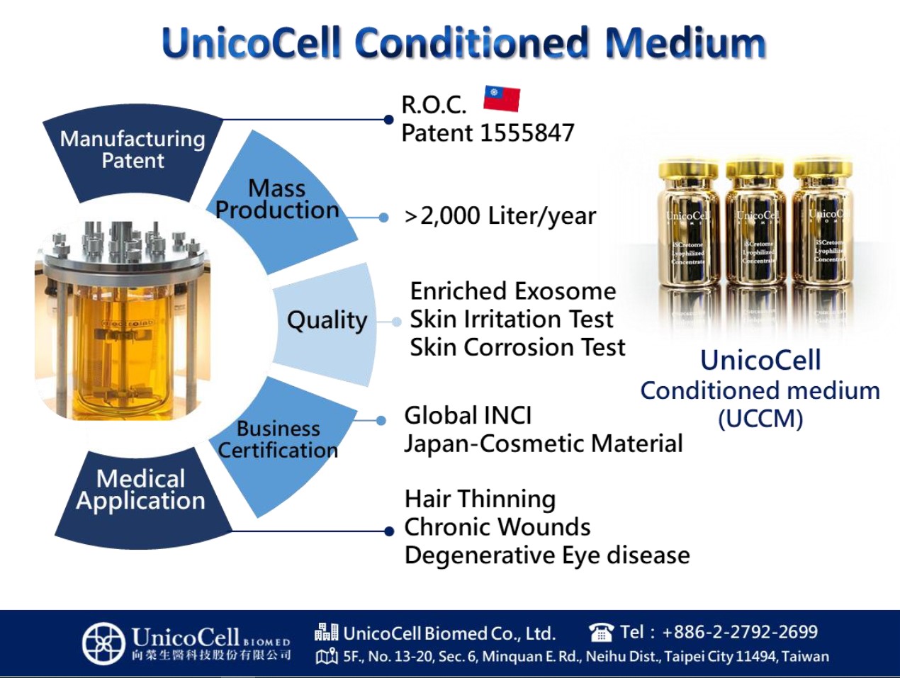 UnicoCell 富含外泌體的幹細胞分泌物,採用3D 製程技術製造,相關技術已在台灣取得發明專利,並於 2024 年榮獲「國家藥物科技獎」製造技術類銅質獎肯定。此外,該分泌物產品亦取得美國 FDA 原料主檔案(MF, Master File)登記及國際化妝品原料名稱(INCI)認證,品質與合規性均達國際標準。與傳統的平板培養方法相比,這種方法可以將幹細胞分泌的因子濃度提高約2到8倍以及富含高濃度外泌體。根據實驗結果,UC-hEV®可以促進傷口癒合、增加膠原蛋白的產生並抑制黑色素的產生。已有安全性檢測報告,確認其對皮膚的急毒性,與不會引起刺激、光毒性和遺傳毒性,且不含重金屬。