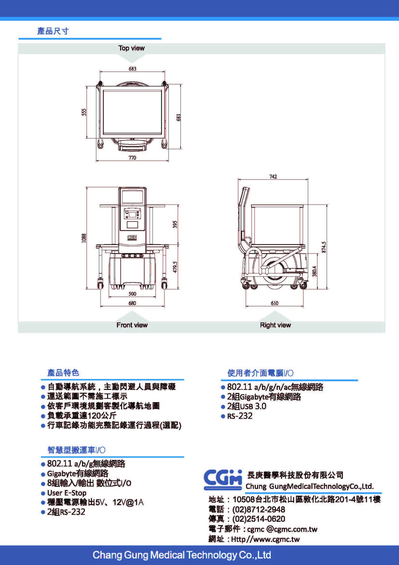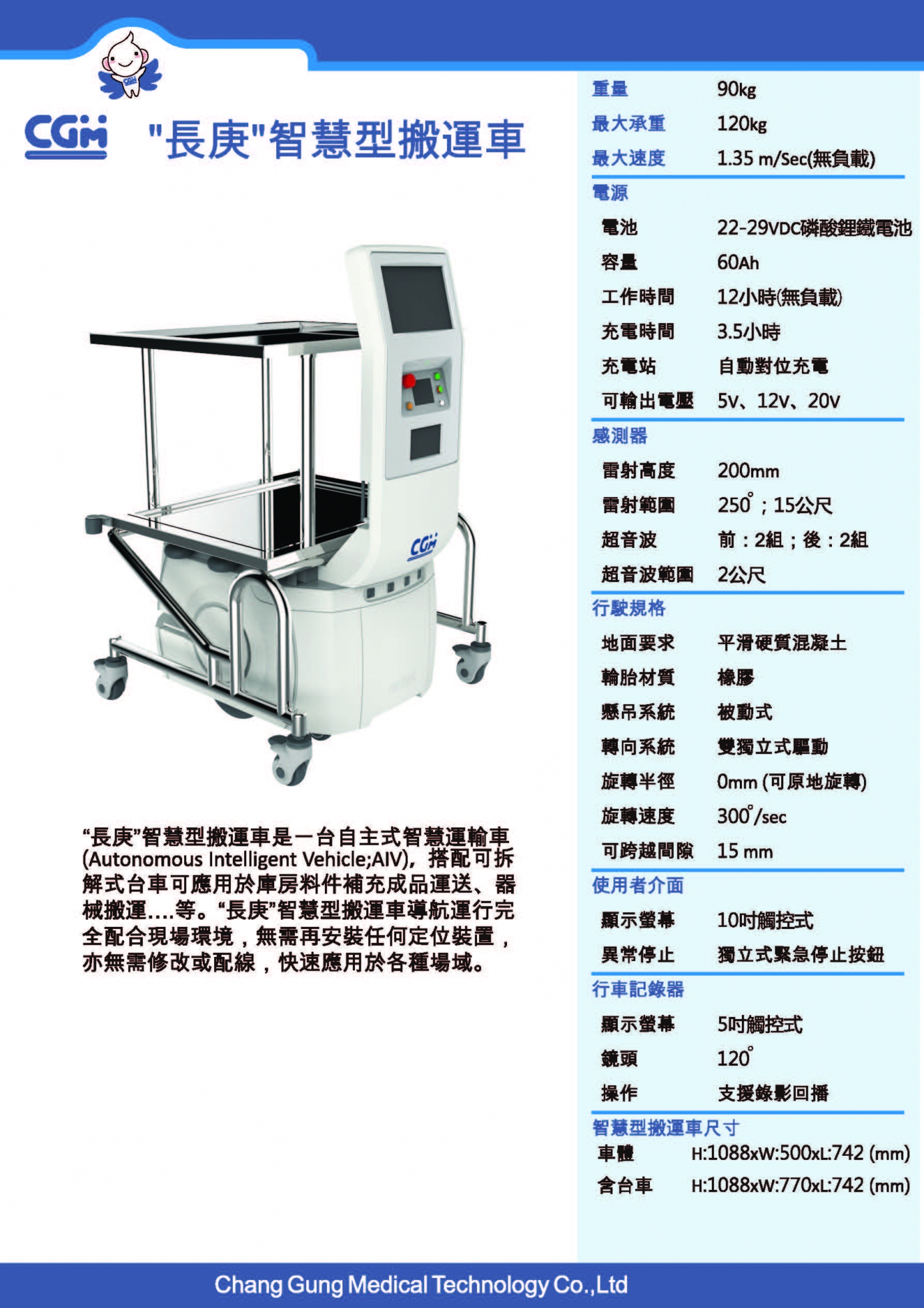 長庚智慧型搬運機器人是一台自主式智慧運輸車,搭配可拆解式台車可應用於庫房料件補充成品運送、器械搬運…等。