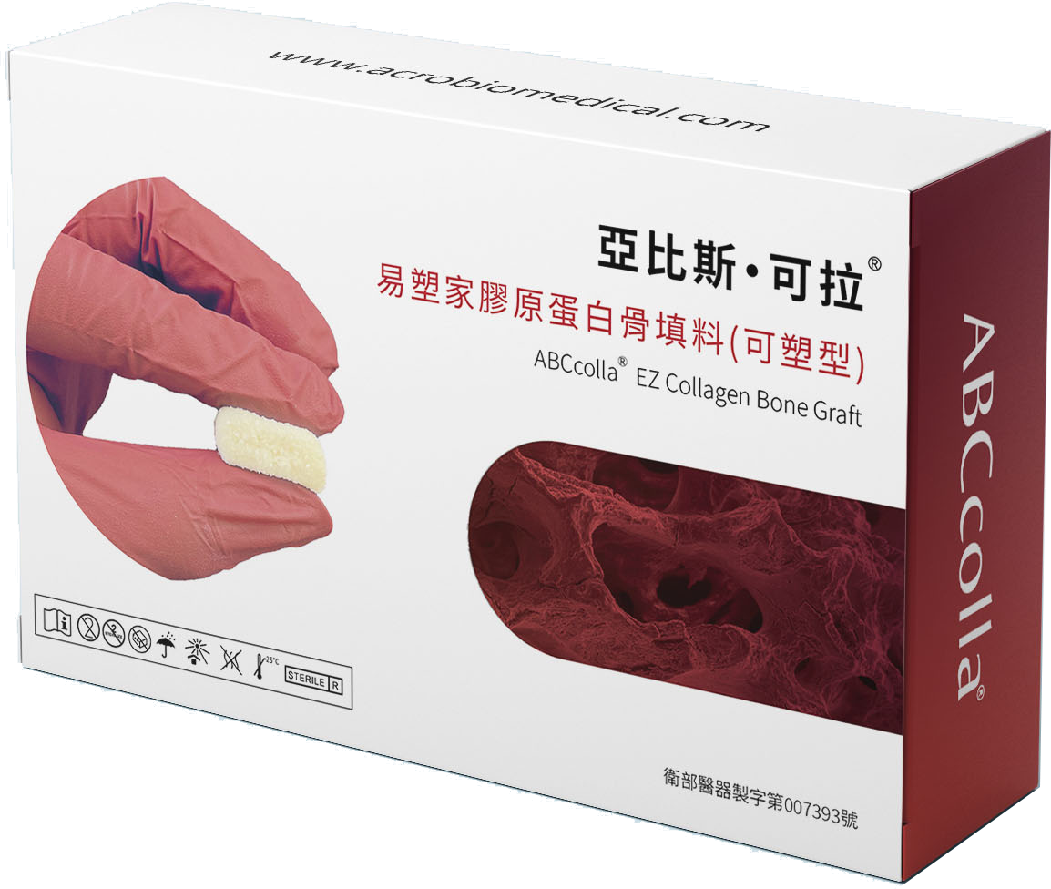 亞比斯.可拉®易塑家膠原蛋白骨填料(可塑型)是含有第一型膠原蛋白之去細胞豬骨以及去細胞豬皮材料,具有多孔結構、物理和化學特性類似於天然的骨基質(含氫氧基磷灰石),並具有絕佳之生物相容性。本產品具有可塑性,於復水後可依缺損部位捏塑成適當形狀大小,更易於填入缺損部位。本產品在骨骼修復過程中,會被人體吸收並置換成新生的骨組織。