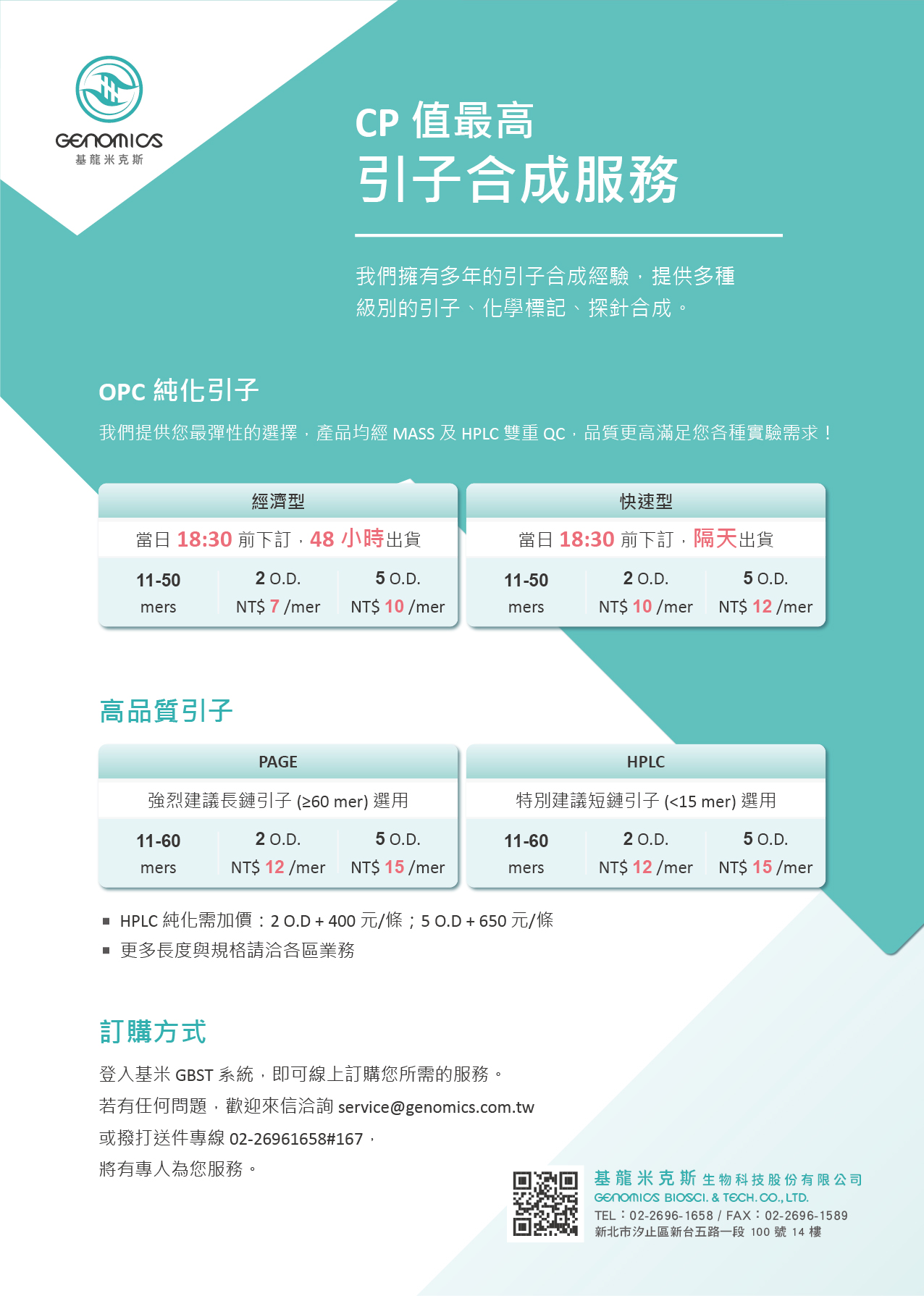 11-50mers 2/5O.D. OPC限定,當日18:30前下單,隔日出貨。