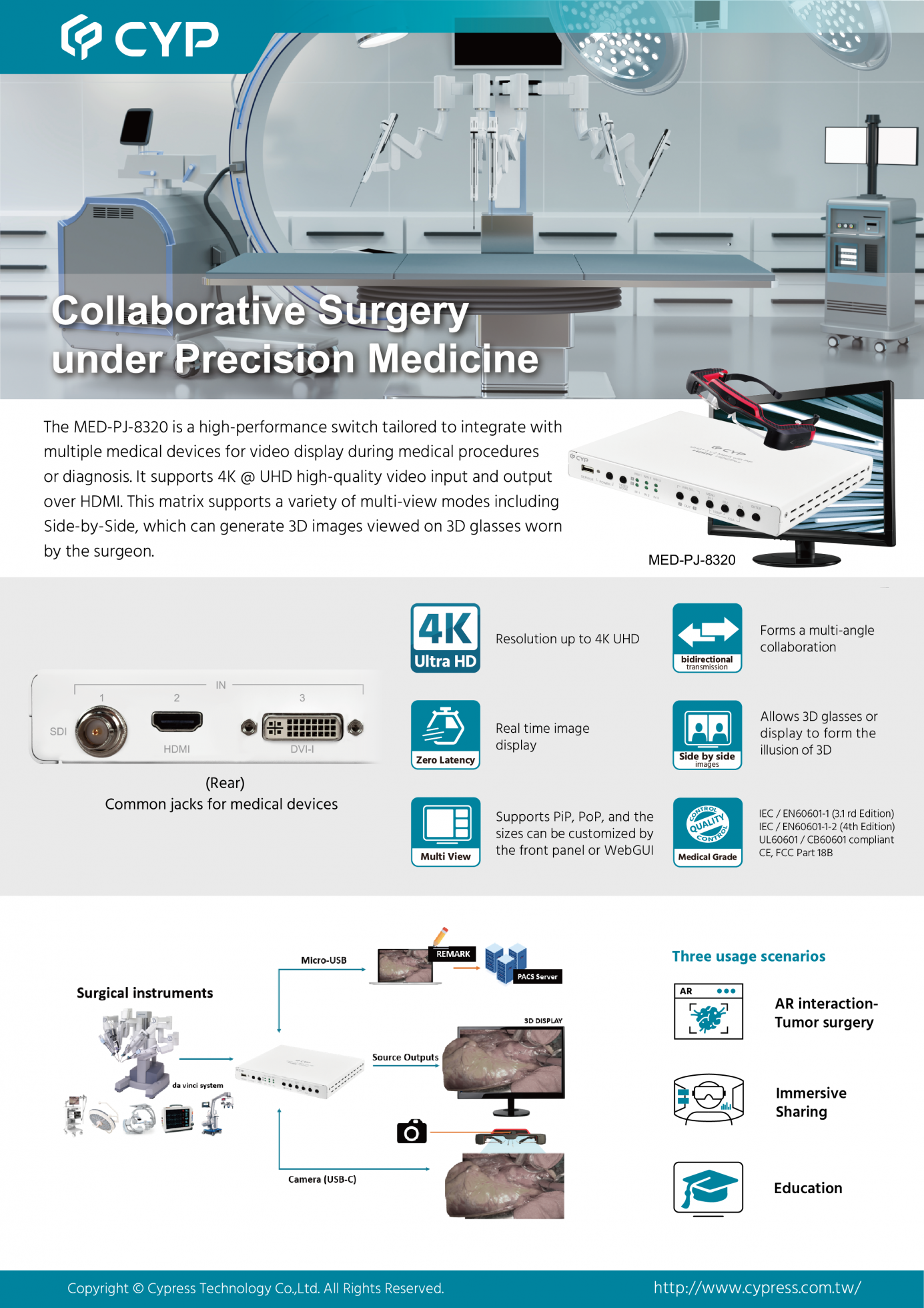 本3 進2 出矩陣是一高性能切換器,其中整合升頻器與多視窗技術。本裝置適用於監控或顯示多種醫療儀器畫面來源,例如內視鏡、X 光系統、超音波,達文西手術系統等,在手術或診療途中能同時顯示。在各個輸出與輸入,影像解析度(SDI 與HDMI)最高可達4K@60Hz,LCPM 音訊則可達7.1 聲道192kHz。本裝置規格完全符合HDCP 2.x 標準。