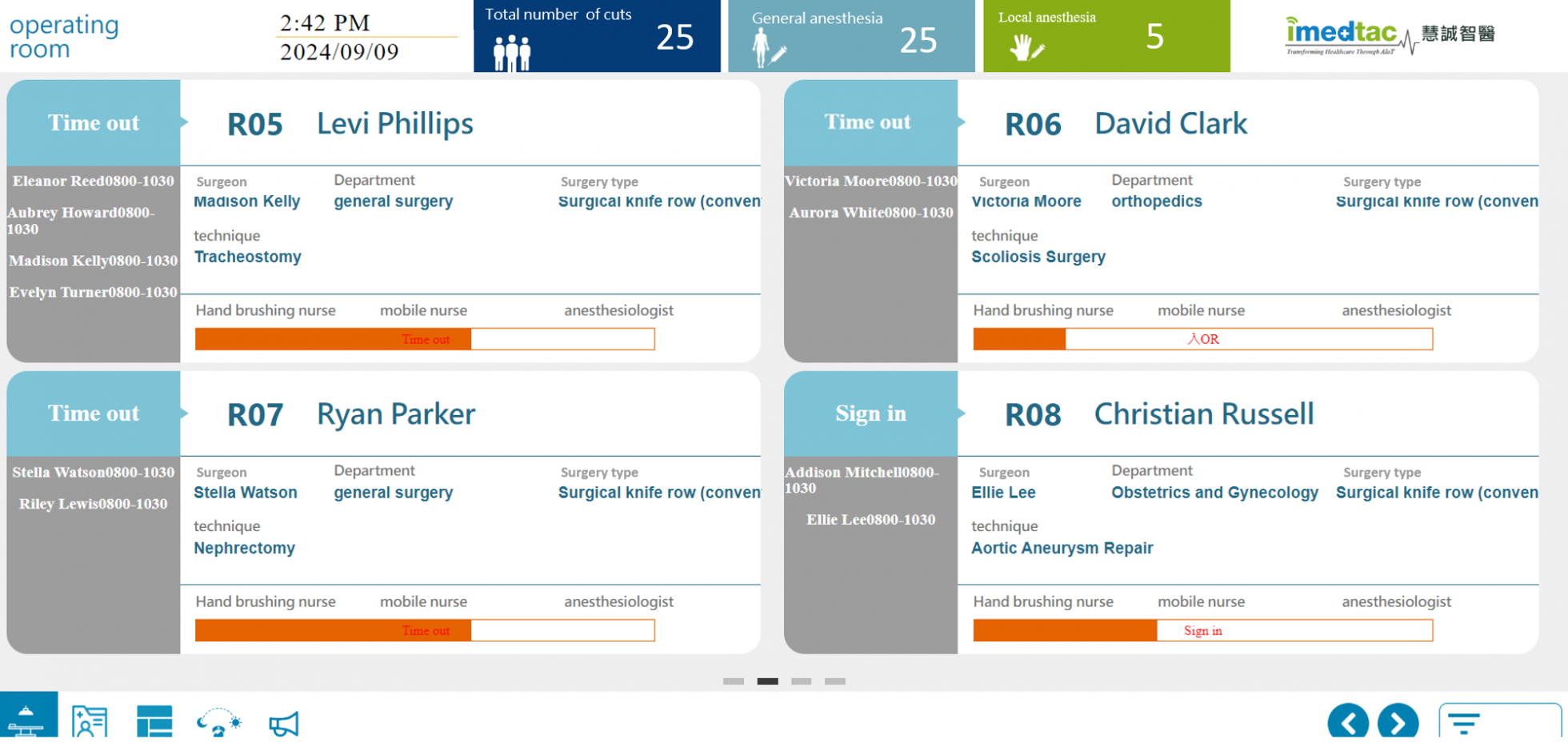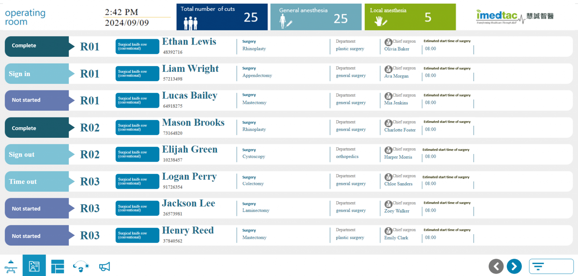 為刀房內的資訊整合系統,整合病患資料及手術進度資訊,讓手術室團隊人員能專注於團隊手術進度,隨時確認病人狀態,提升病人手術安全,並且讓手術前、中、後流程更順暢。