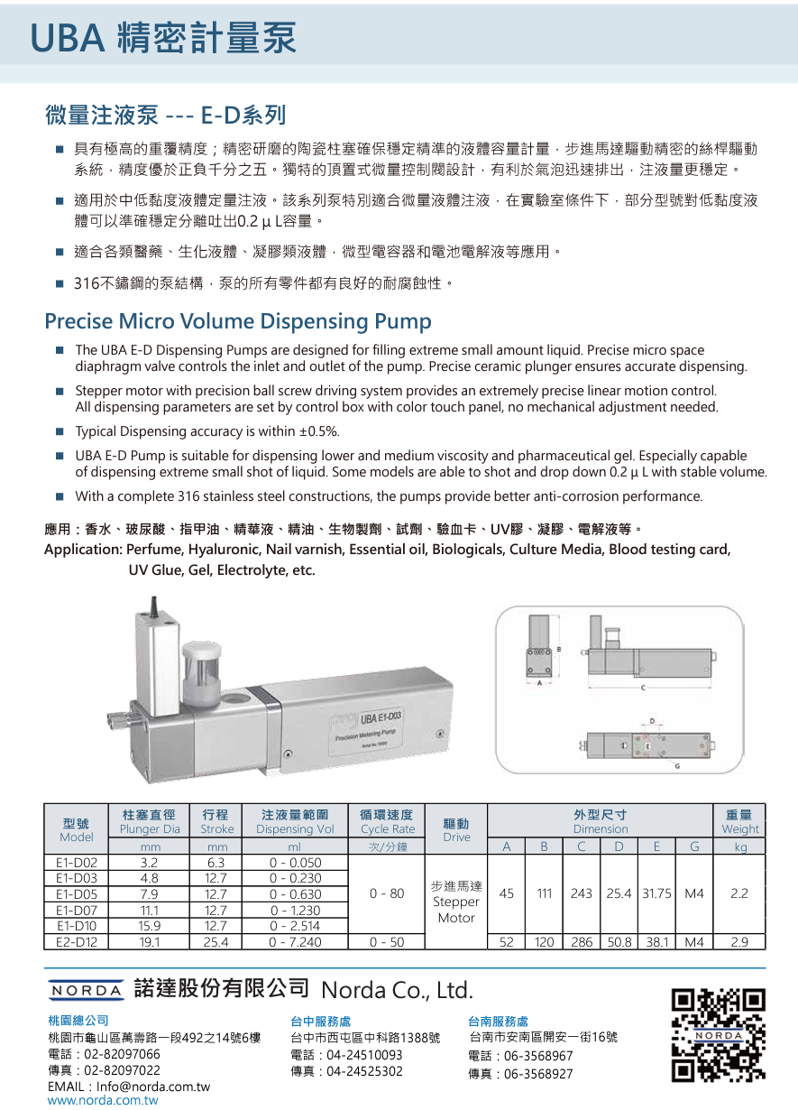 UBA優霸 E-D系列精密微量定量泵浦採用精密陶瓷柱塞,並以步進馬達驅動精密的滾珠絲桿系統,以確保穩定、精準地液體容量,吐出量之重複精度優於±0.5%。獨特的頂置式微量控制閥設計,有利於氣泡的迅速排出,注液量更穩定。
