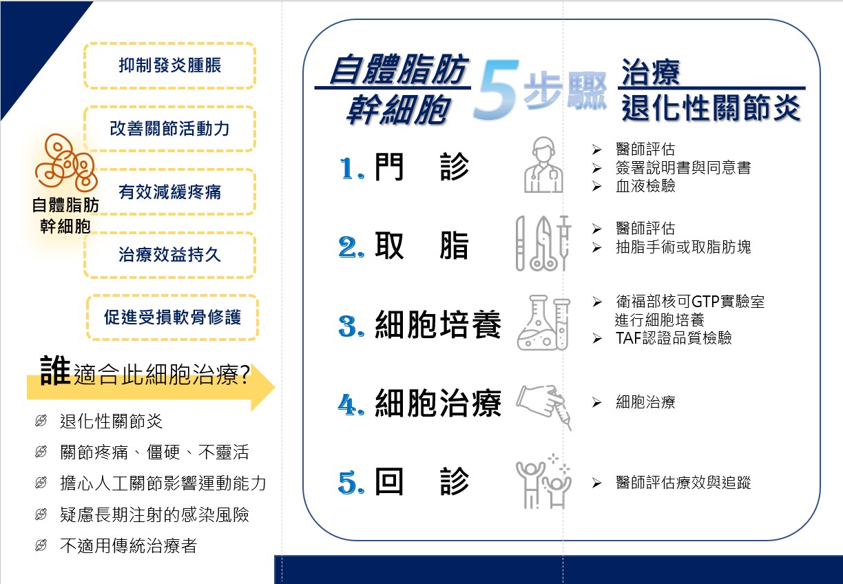 ˙ 治療應用:我們的自體脂肪幹細胞醫療技術可應用於治療膝骨關節炎,遵循特管辦法的相關規定,與各大醫療機構合作,提供病人多樣化的治療選擇。本治療技術已成功實施治療超過40位患者,並持續追蹤其治療效果。