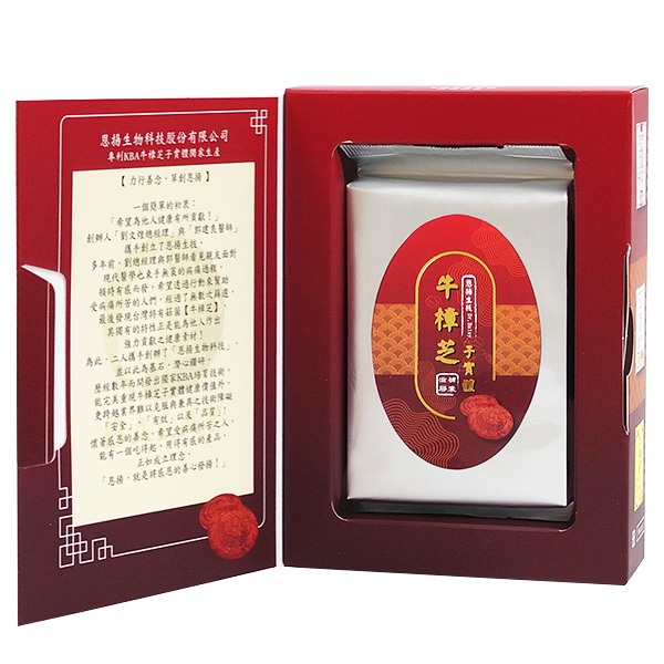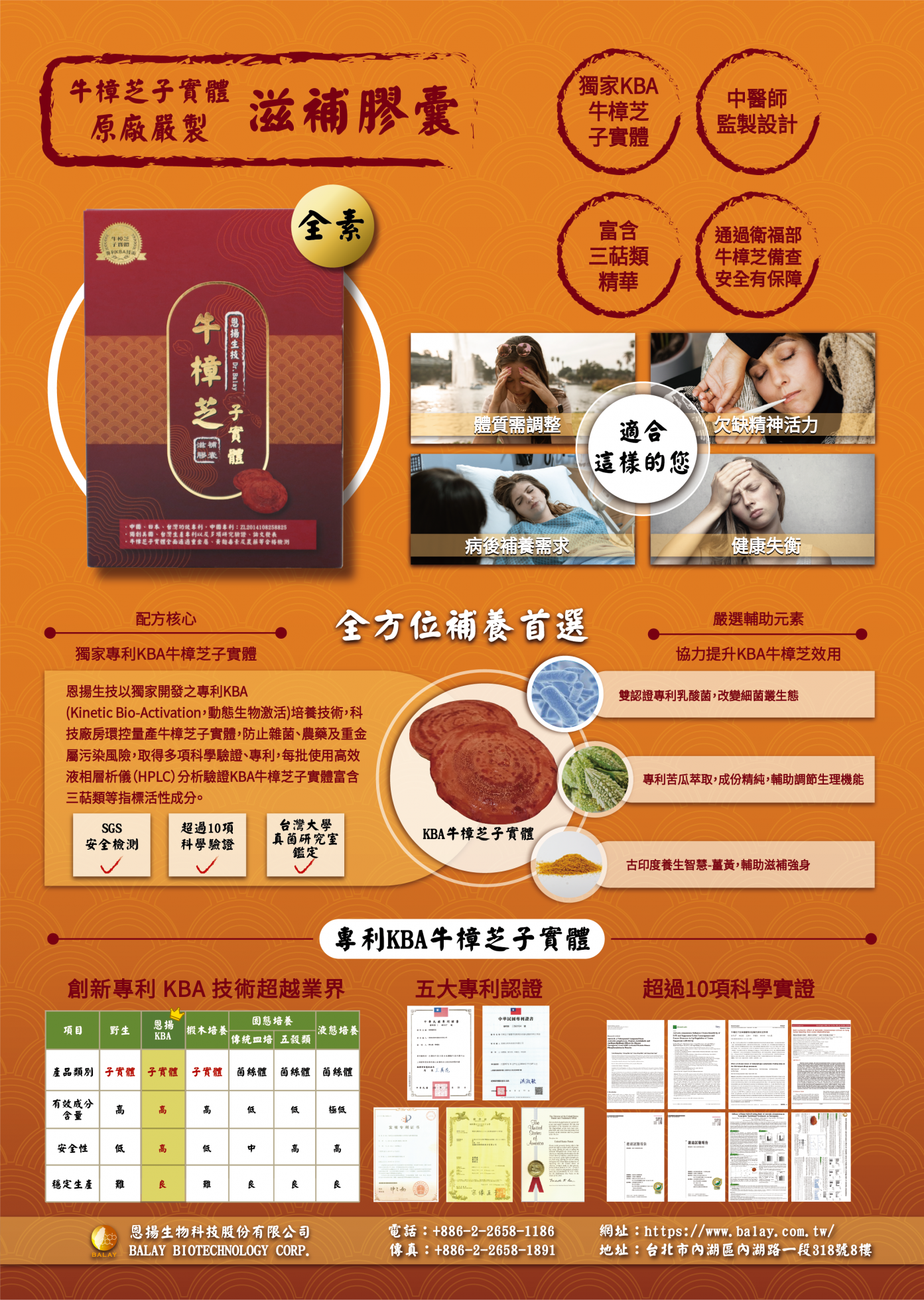100%恩揚生技自產關鍵專利原料,不外購、不契作。富含牛樟芝子實體最珍貴的活性成分-樟芝酸三萜類。已取得5篇國內外發明專利、6篇SCI國際論文、超過32項安全性及功效性科研成果;經台美檢驗科技(SuperLab)科研機構動物實驗結果證實:食用專利KBA牛樟芝子實體可幫助精神旺盛、滋補強身。