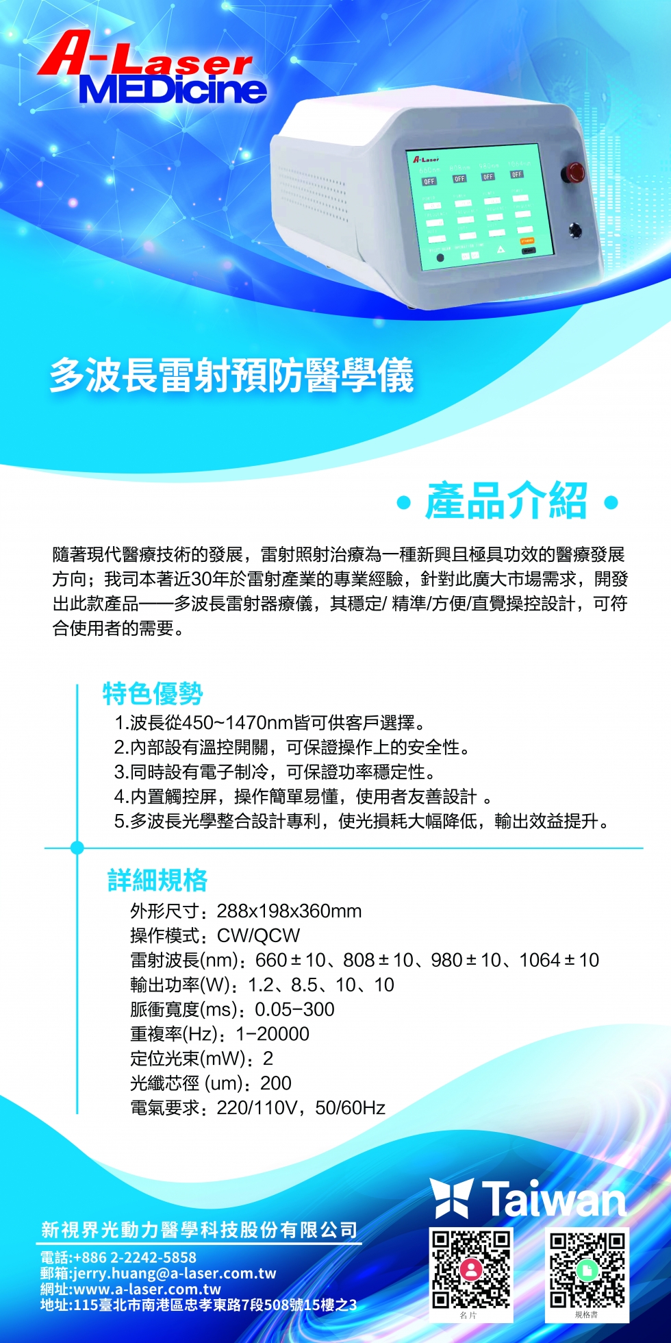 隨著現代醫療技術的發展,雷射照射治療為一種新興且極具功效的醫療發展方向; 我司本著近30年於雷射產業的專業經驗,針對此廣大市場需求,開發出此款產品-----多波長雷射醫療儀,其穩定/ 精準/方便/直覺操控設計,可符合使用者的需要。