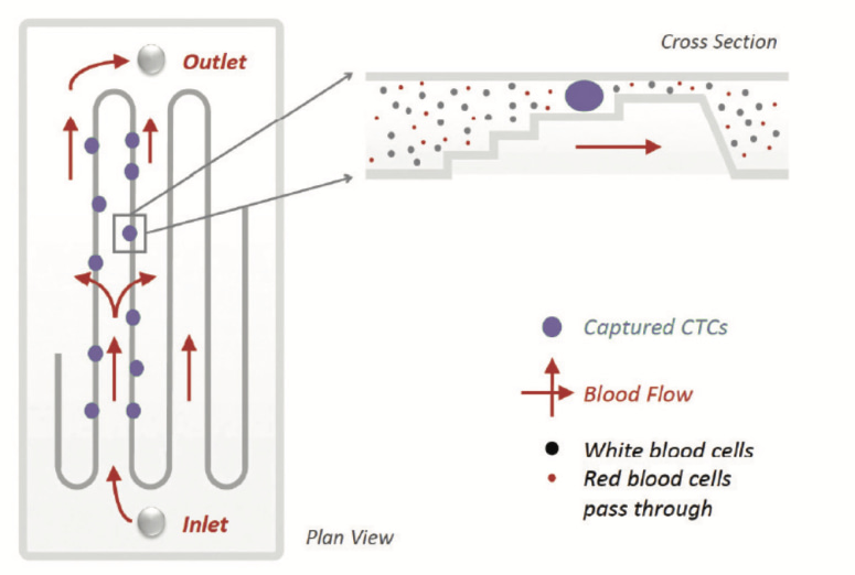 基於CTC與全血其他細胞不同特性來捕獲。(CTC具有可變形性差、尺寸大的特性)