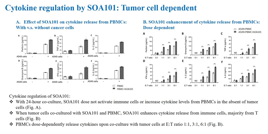 相較於血液腫瘤,實體腫瘤有更複雜的腫瘤微環境(TME),現行許多治療方法,包括免疫檢查點抑制劑 (ICI),因抗藥性高,只有20-30%病人獲益。聖安生醫研發出的次世代抗癌奈米抗體藥物,「奈米三特異性雙免疫檢查點T細胞銜接奈米抗體(SOA101)」,設計包含三個專一性標靶,其中針對兩個腫瘤細胞上免疫檢查點 (PD-L1, HLA-G) 進行抑制,改變腫瘤微環境以減少對免疫檢查點抑制劑的抗藥性; 同時另一專一性標靶,可連結T細胞表面CD3,局部活化T 細胞,增強T細胞毒殺腫瘤的能力。本產品的另一項特色,奈米靶頭有高度親和力,確保抗體對腫瘤細胞的專一性,減少副作用,提高病人用藥安全性。SOA101為廣效抗癌新藥,預期用於肺癌、頭頸癌、乳癌、卵巢癌、直腸癌及其他實體癌的治療。以肺癌為例,根據WHO統計,肺癌為全球第二大佔比的癌症。亞太地區又以非小細胞肺癌,佔肺癌確診數的80~85%,通常於發現時已進入晚期階段;即便有標靶藥物、免疫檢查點抑制劑及化學藥物治療,5年存活率仍從第三期的15.1%下降到第四期的6%,是極度惡性的癌症類型,醫學上急需開發有效治療的新藥。本產品預計2025年在美國FDA監管下進入臨床試驗。