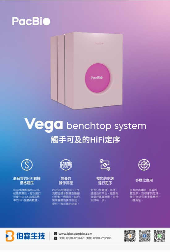 •先進技術: VEGA™ 系統採用最新 HiFi 定序技術,提供更長的讀長和更高的準確性,適合複雜基因體的解析,包括結構變異和重複序列分析。