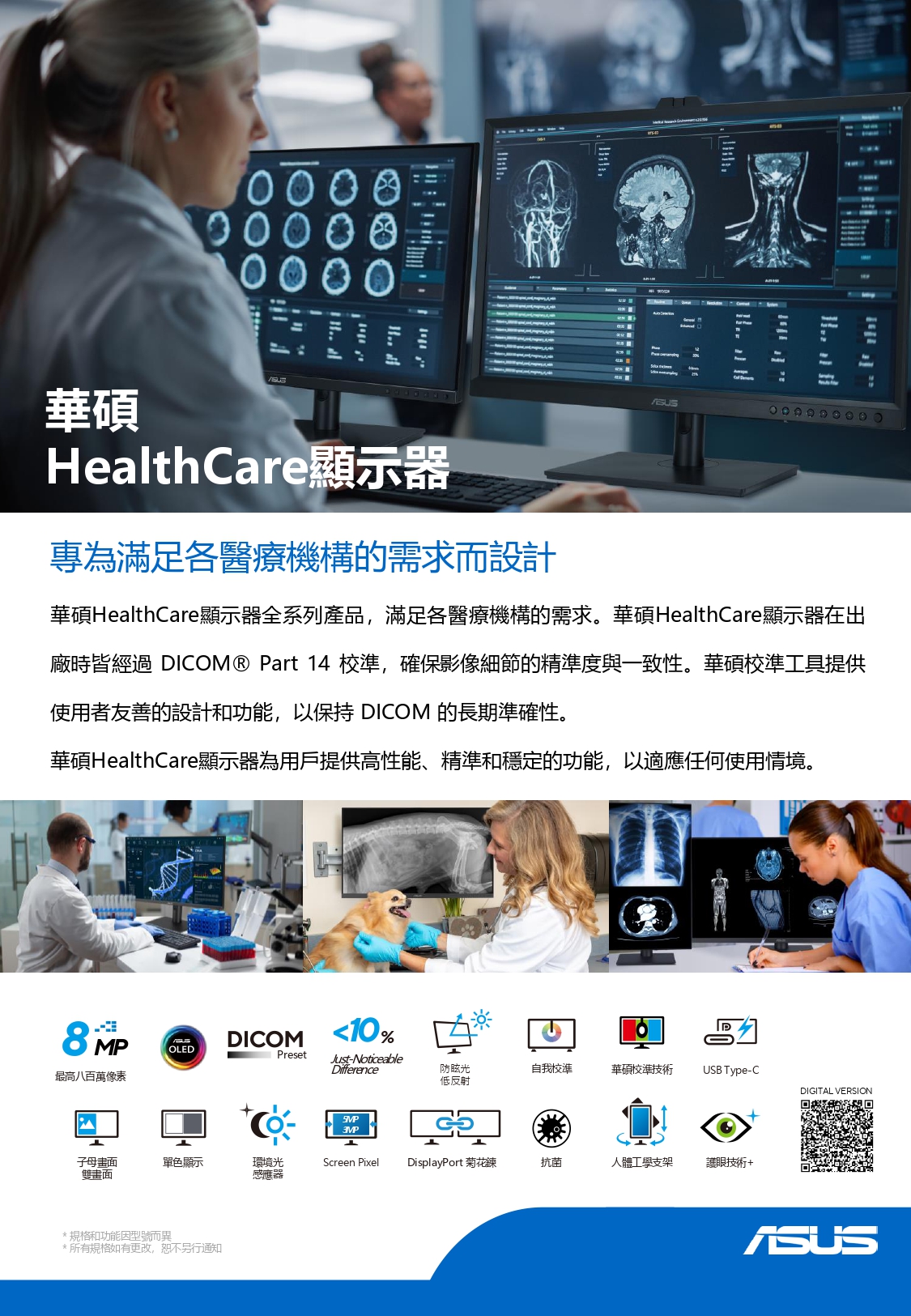 華碩 HealthCare 顯示器提供全面的產品線,以滿足每個醫學保健機構的需求。華碩 Healthcare 顯示器皆有出廠校準,符合 DICOM® Part 14 GSDF(灰階標準顯示功能)標準,以確保視覺精準度和一致性的細節。華碩 HA3281A 採用 31.5 吋 800 萬畫素防眩光、低反射(AGLR)純色 RGB OLED 面板,內建的自動翻轉色度計支援自我 / 硬體校色技術支援自動校色保持 DICOM 長期精準度。華碩 Healthcare 顯示器提供高性能,精確和穩定的功能,以適應任何場景。