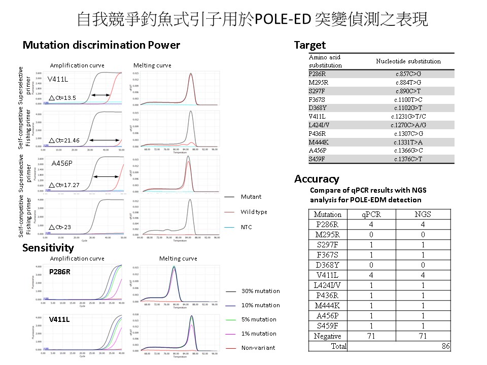 子宮內膜癌的治療已步入分子診斷時代,其治療決策及預後評估均以分子分類為準則。在相關生物標記中,p53及MMR相關基因的變異可透過免疫組織化學染色檢測獲得結果,然而POLE基因突變的檢測需仰賴次世代定序技術。由於次世代定序檢測成本高昂且耗時較長,目前尚未廣泛應用於臨床實務,導致多數醫院無法為子宮內膜癌患者提供完整的分子分類檢測。本發明開發了一種創新的檢測方法,運用定量聚合酶鏈反應(qPCR)技術,搭配新穎設計的核酸引子,專門針對POLE基因外切酶區域的突變點進行精確檢測。基於此設計所開發的POLE外切酶區突變檢測套組,其突變檢測靈敏度可達1%的低水準。經與次世代定序檢測結果進行比對驗證,在11個病理性突變位點的分析結果均呈現高度一致性。此檢測技術的優勢在於無需額外合成含替代核苷酸的寡核苷酸阻斷劑,亦無需購置昂貴的檢測設備,因此具備成本低廉、檢測快速的特點,能夠迅速提供臨床所需的檢測結果,具有極高的臨床推廣價值及商業應用潛力。
