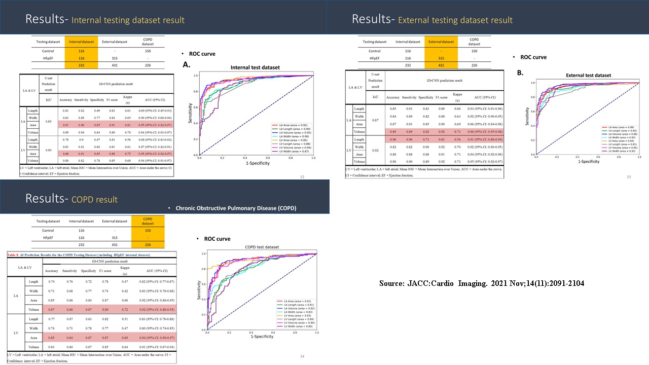 這項專利旨在通過使用人工智慧技術基於左心室和左心房以及單心率內動態變化來篩檢臨床上極為挑戰的正常收縮分率心衰竭的心臟超音波圖,從而建立人工智慧輔助舒張性心衰竭快速預篩檢工具。儘管正常收縮分率心衰竭的診斷標準已經確立,但步驟十分繁瑣耗時,也需要資深醫師之經驗才能進行診斷,因此通過超聲心動圖對正常收縮分率心衰竭進行快速且準確的評估仍非常具有挑戰性。本研究總共包括了1263名患有正常收縮分率心衰竭的病患和1041名臨床上沒有心衰竭病史的個體。我們從超聲心動圖文件中提取參與者的四腔視圖圖像(A4C view),並將其隨機分為訓練(n = 1865),驗證(n = 207)和內部測試數據集(n = 232)。此外,也從另一家醫院獲得了外部測試數據集(n = 315)來驗證我們的模型。我們將超聲心動圖的影片轉換成影像,並且提取左心室和左心房的收縮及舒張末期範圍面積,藉此訓練人工智慧模型來做分類。在內部測試數據集中,用於檢測舒張性心衰竭的最佳人工智慧模型的準確性,敏感性和特異性分別為0.91、0.96和0.85。外部測試數據集中的數據分別為0.90、0.90和0.89。在ROC曲線下的面積用於評估模型的分類能力。內部測試數據集中的最高AUC為0.95,而外部測試數據集中的最高AUC為0.96。我們設計的正常收縮分率心衰竭人工智慧篩檢系統是一種快速、省時且準確的預篩查方法,該方法結合了新穎的單心率內動態變化概念,可協助進行正常收縮分率心衰竭診斷。除了診斷結果的分類外,這種方法還可以自動計算診斷慧使用的心臟參數,以幫助臨床醫生能更快速診斷正常收縮分率心衰竭。