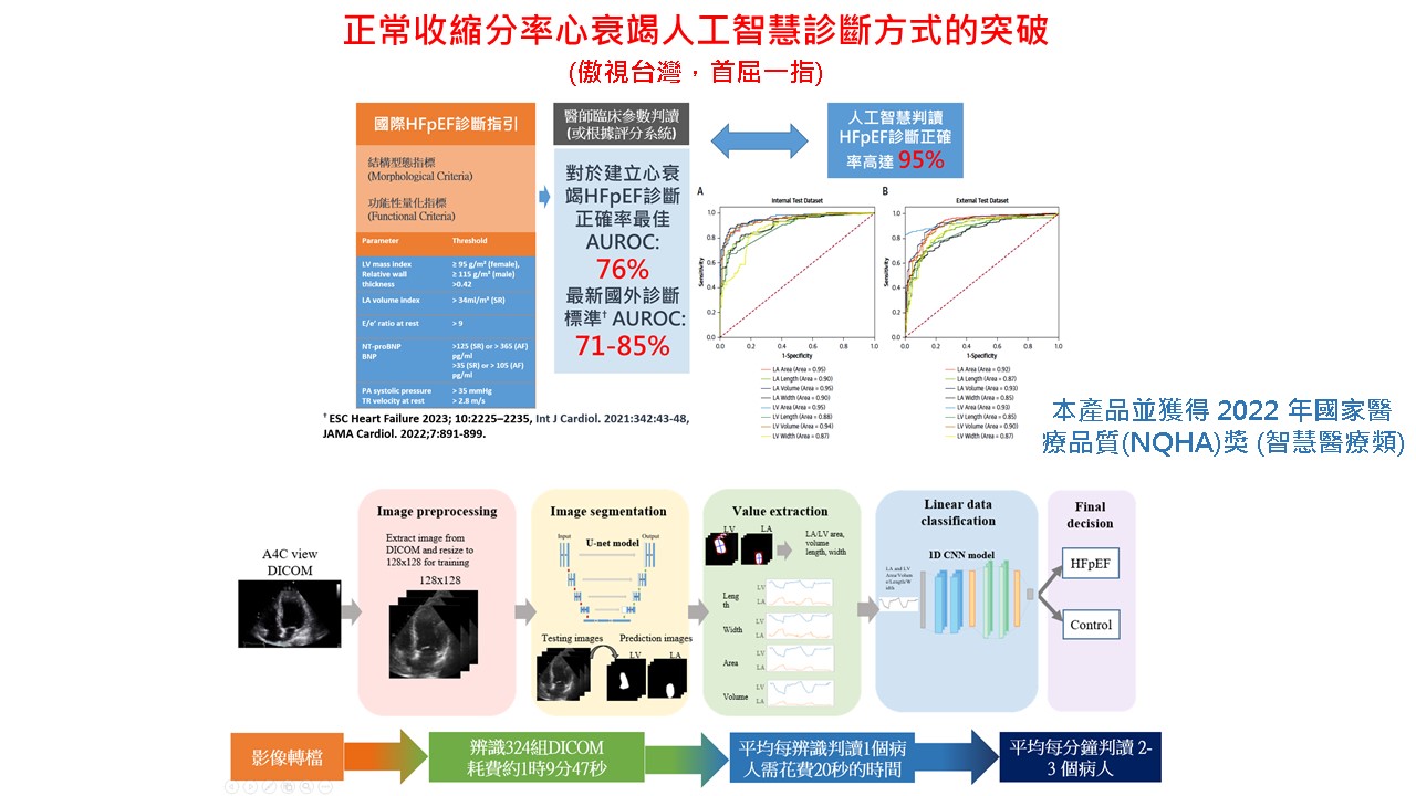 本產品透過心臟超音波動態影像,唯獨只使用單一心率、單一四腔室影像,在1分鐘的時間內完成快速預篩檢臨床上高難度挑戰的正常收縮分率心衰竭,作為臨床診療和醫療決策的參考,本產品優勢在於具有相當高的精準度,也兼顧臨床方便性和高效率。