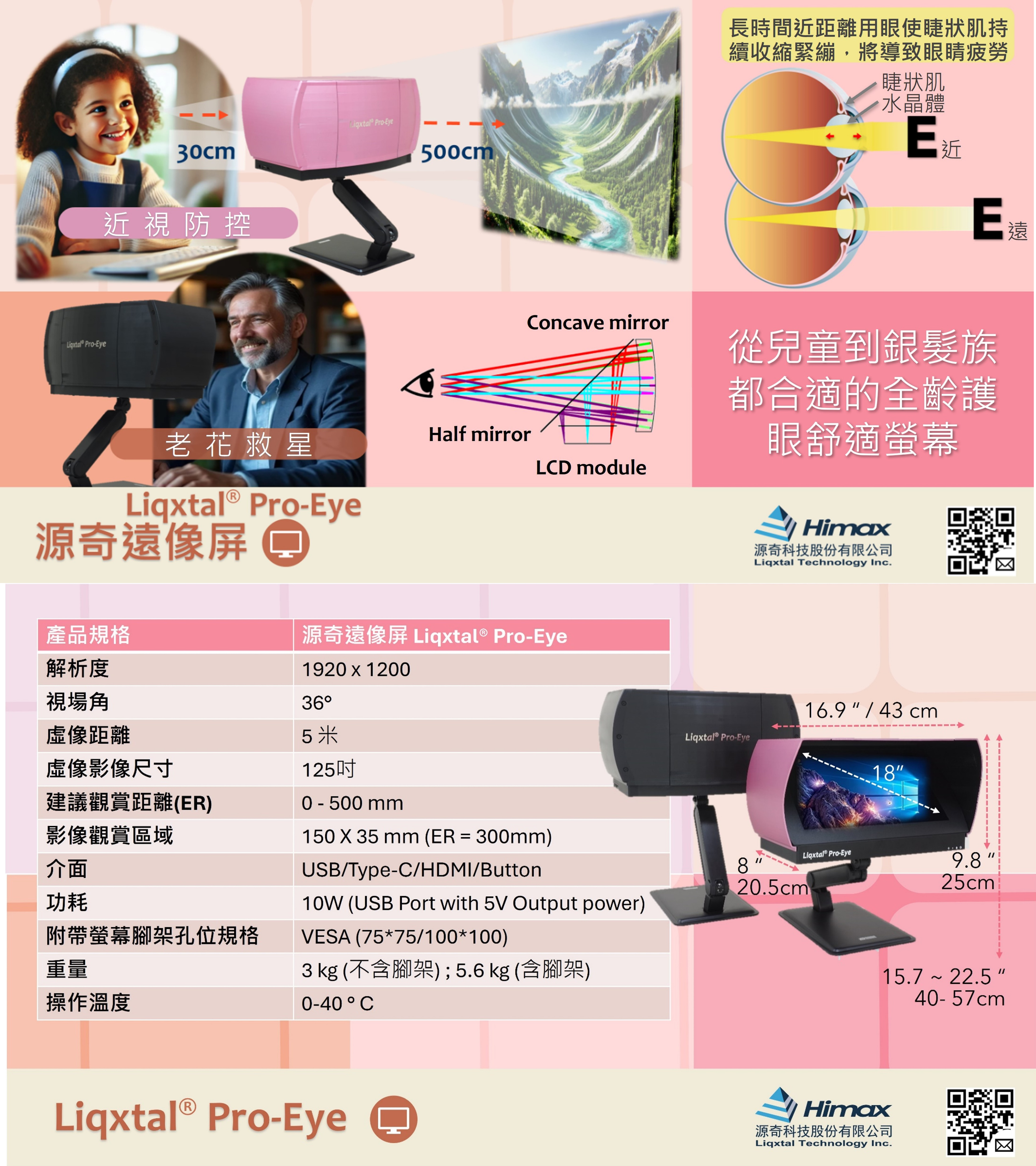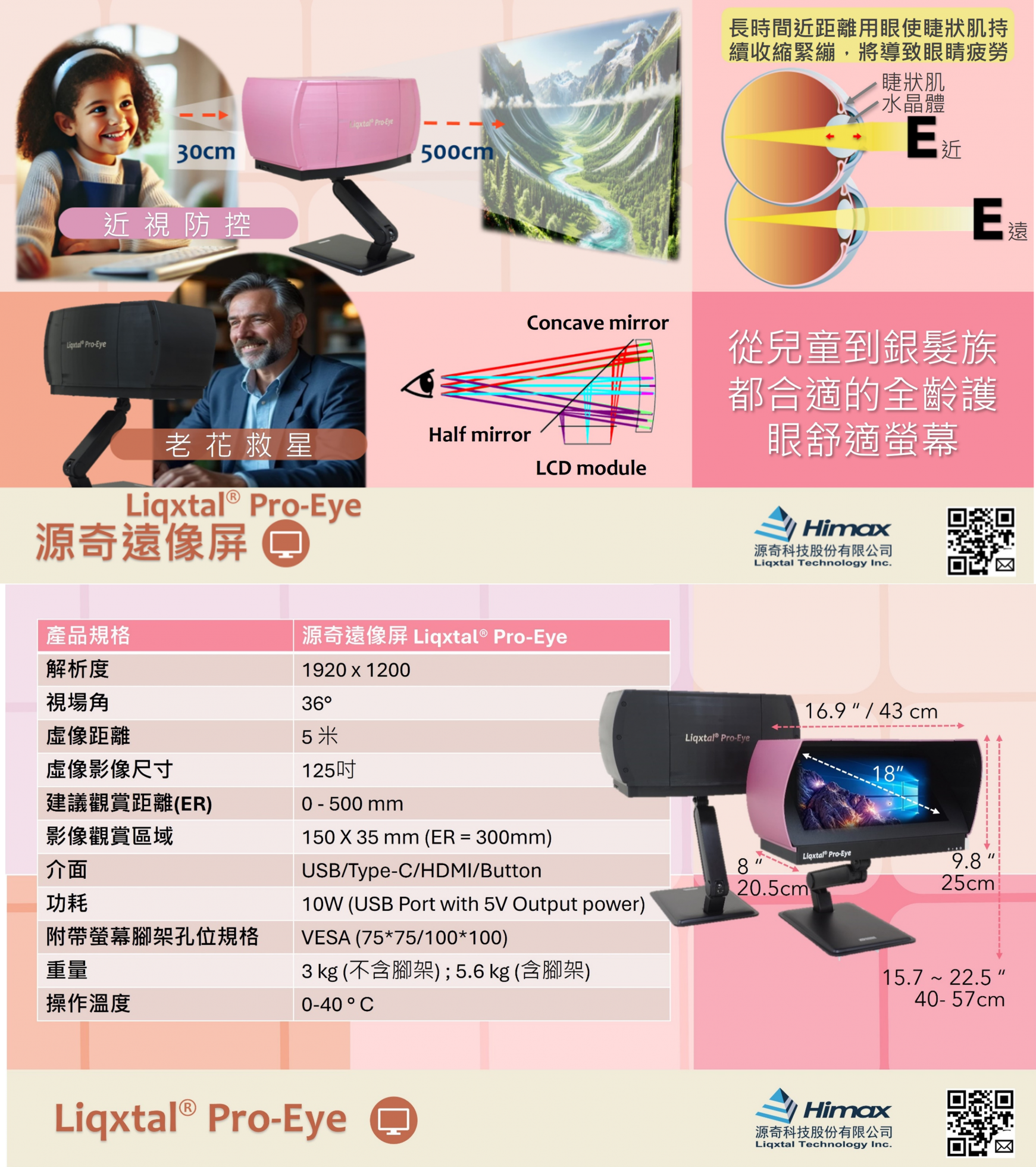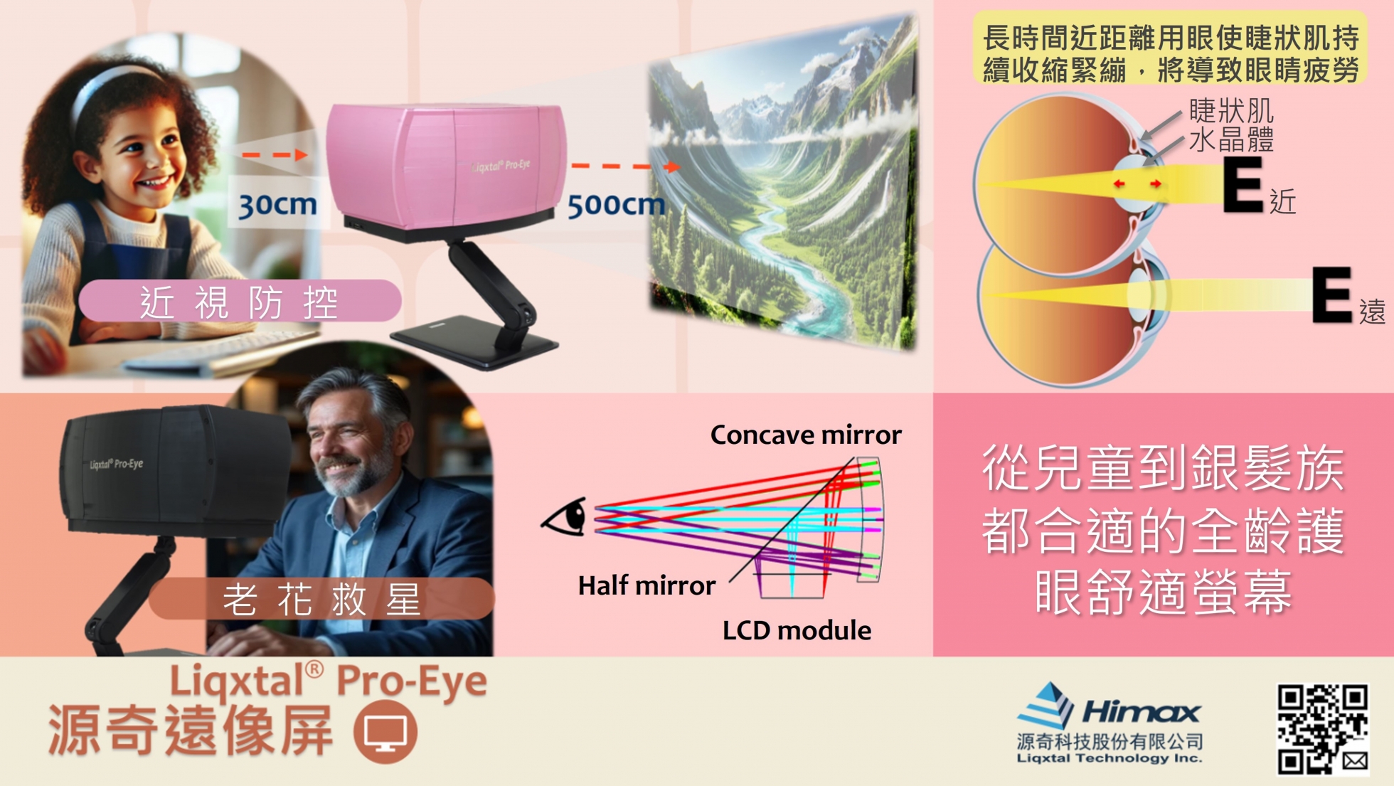 Liqxtal® Pro-Eye 源奇遠像螢幕是一款專為守護視力設計的專利產品顯示器,特別聚焦熟齡族群的老花問 題,以及學齡近視族群的近視延緩。Pro-Eye 獨特設計優化至最舒適的虛擬觀看距離,有效緩解睫狀肌疲勞,減少視力負擔。 特別適合現代以螢幕為中心的數位生活方式Liqxtal Pro-Eye 重新定義了個人化營幕的互動體驗,大幅減少眼部負擔,為日常使用帶來 絕佳舒適與清晰體驗。